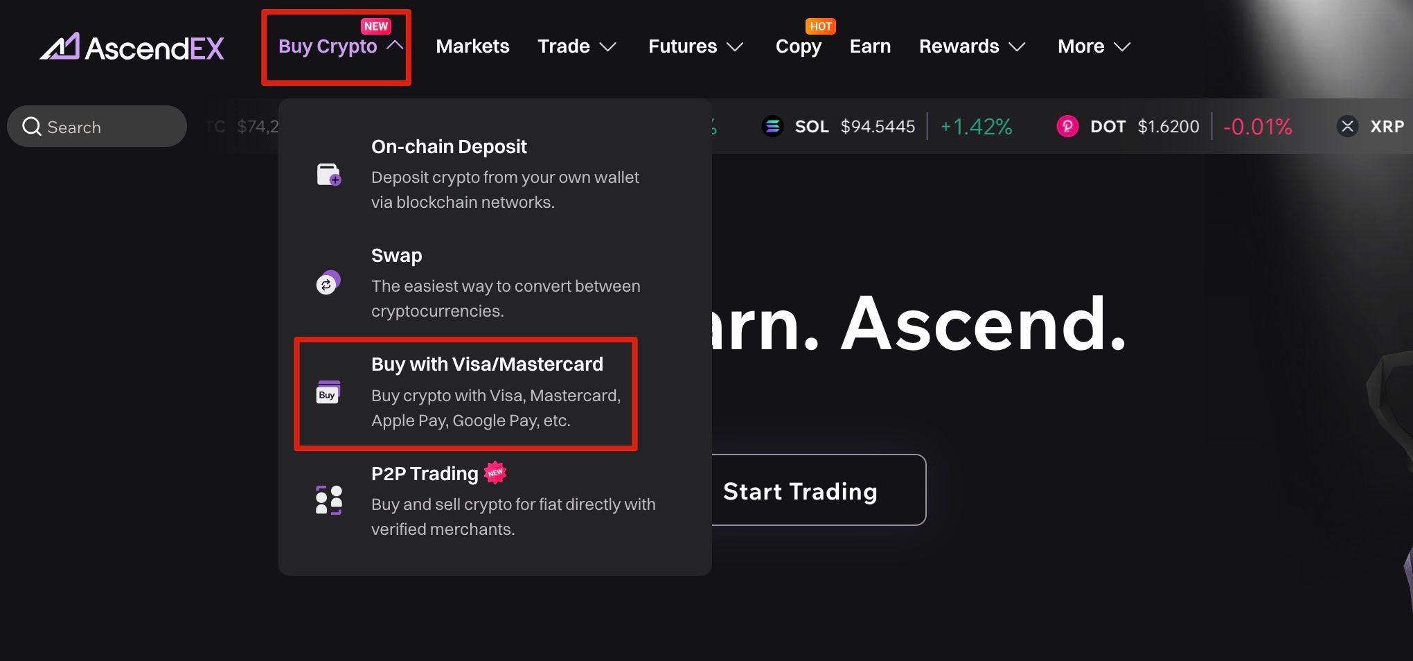 1. Log in to your AscendEX account on your PC and click [Buy Crypto] on the top left corner of the homepage, then select [Buy with Visa/Mastercard].