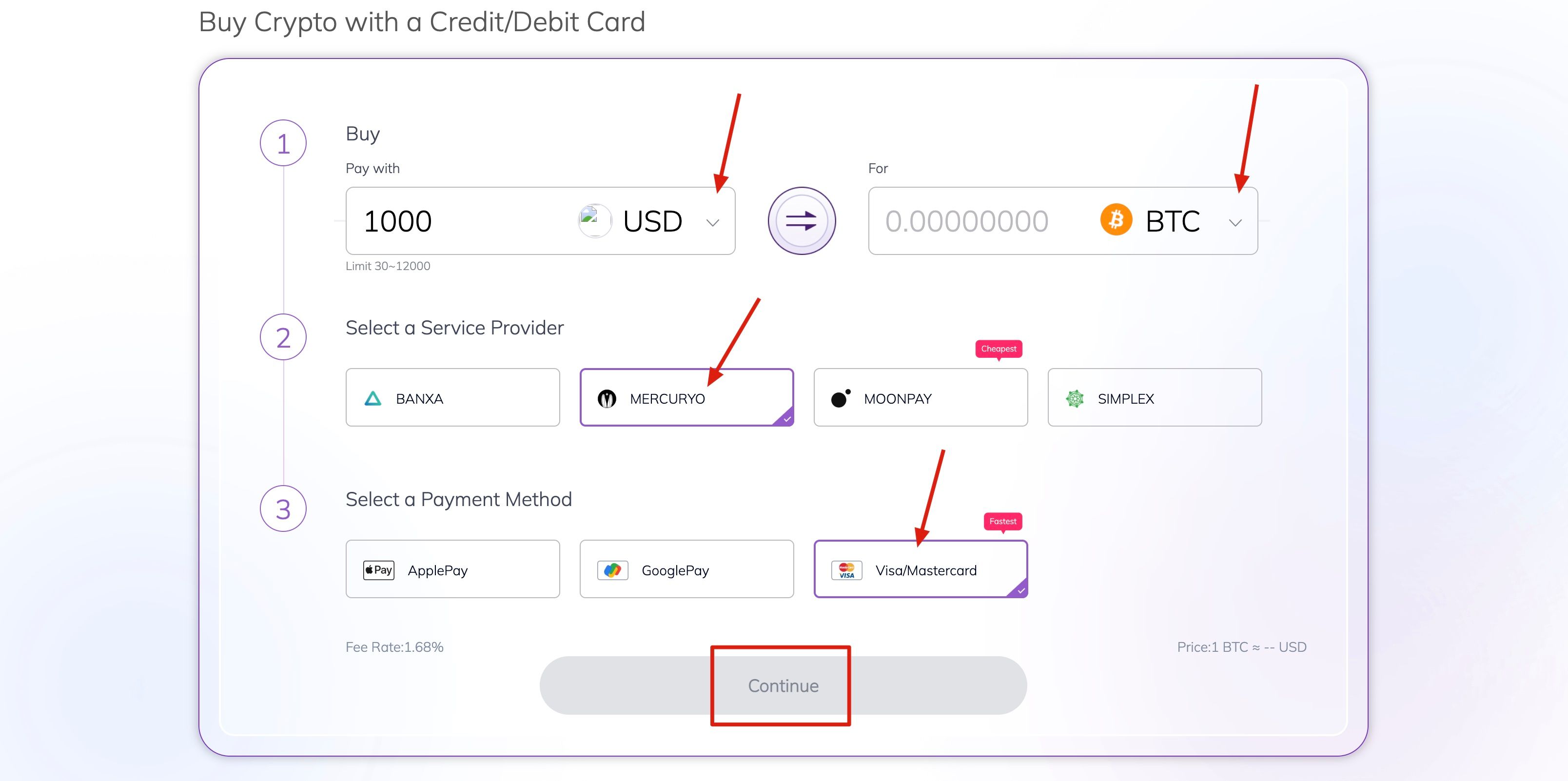 2. On the crypto purchase page, select the digital assets you want to buy and a fiat currency for payment and enter the total value of the fiat currency. Select MERCURYO as the service provider and an available payment method. Confirm all the information of your order: crypto amount and total fiat currency value and then click [Continue].