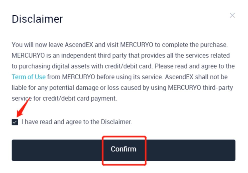 As soon as the crypto - transaction is completed, you receive an email from mercuryo with all the details of the transaction, including the amount of fiat debited, the amount of crypto sent, Mercuryo ID of the transaction, top-up address. You will also receive a deposit notification email from AscendEX once your purchased asset is being deposited into your account upon the purchase completion.