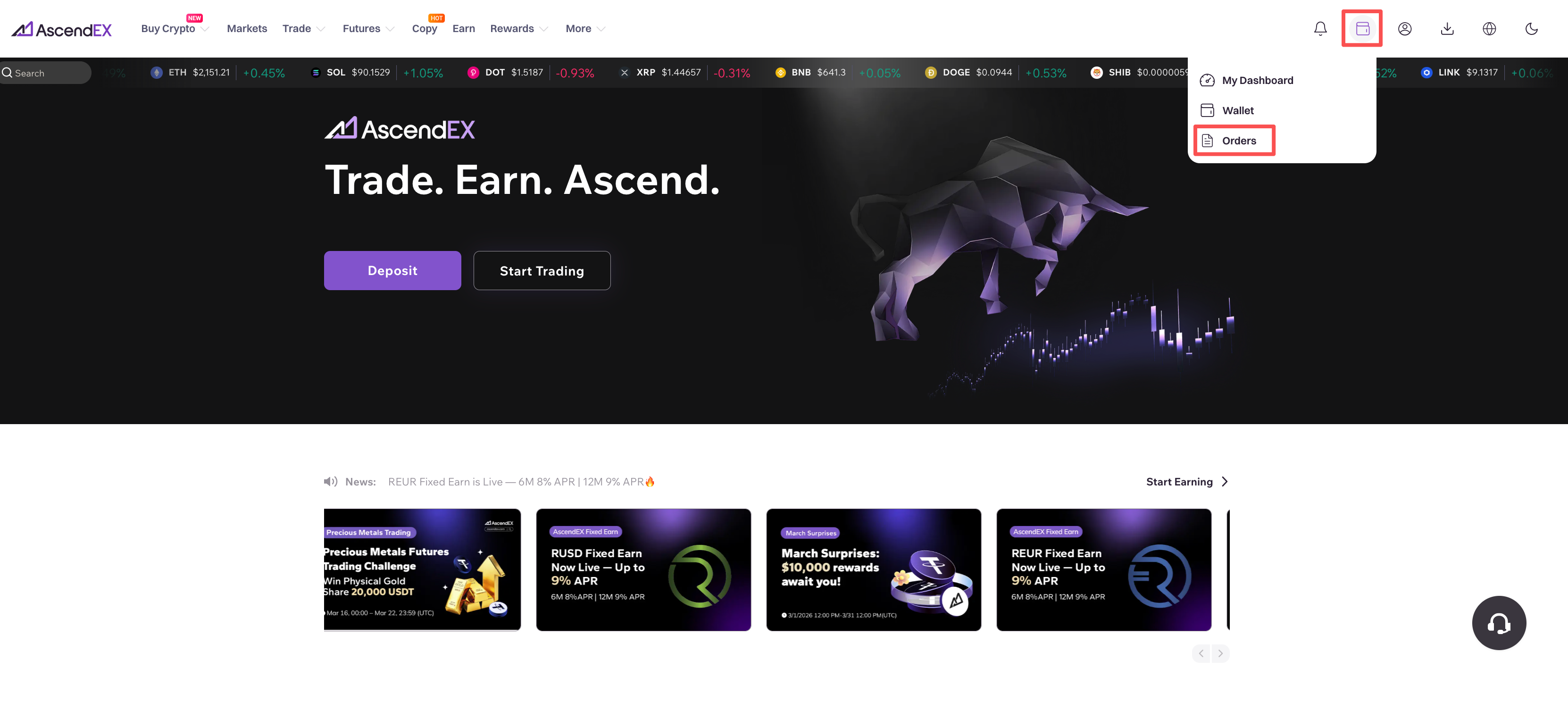 1) Open the AscendEX website and click on “Orders” in the upper right corner of the homepage.