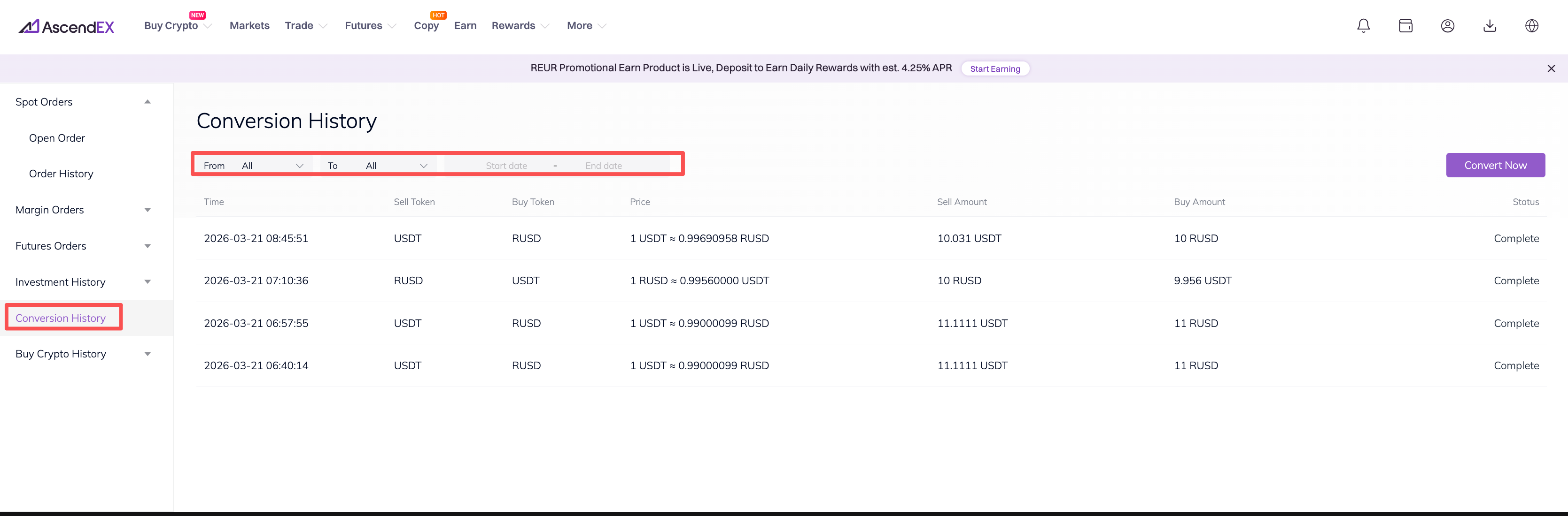 2) Select “Conversion History” . On the “Conversion History” page, you can view the sold tokens, bought tokens, price, sell/buy amount and status. You can also user filters to check the conversion history of a specific token.