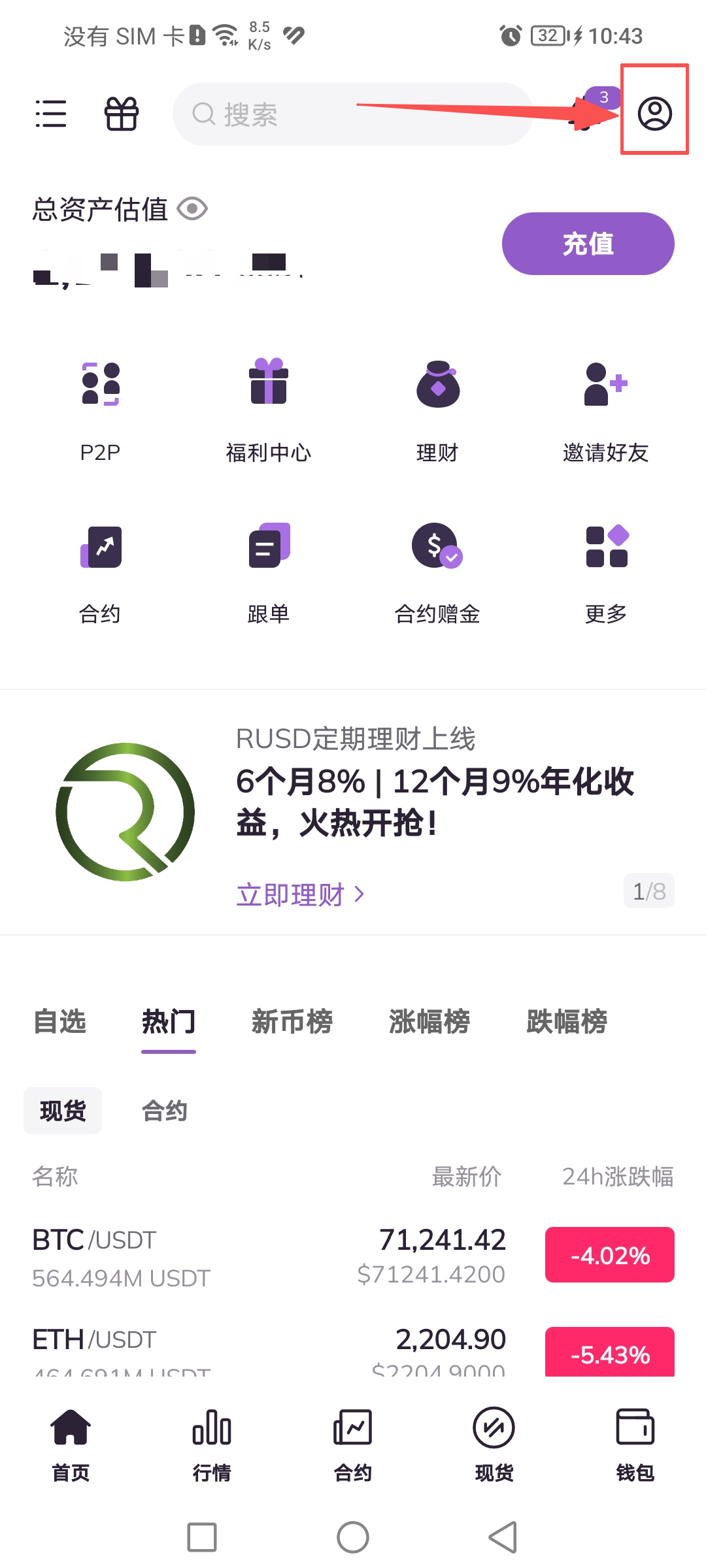 刷新1.打开AscendEX APP,点击首页右上角个人头像。