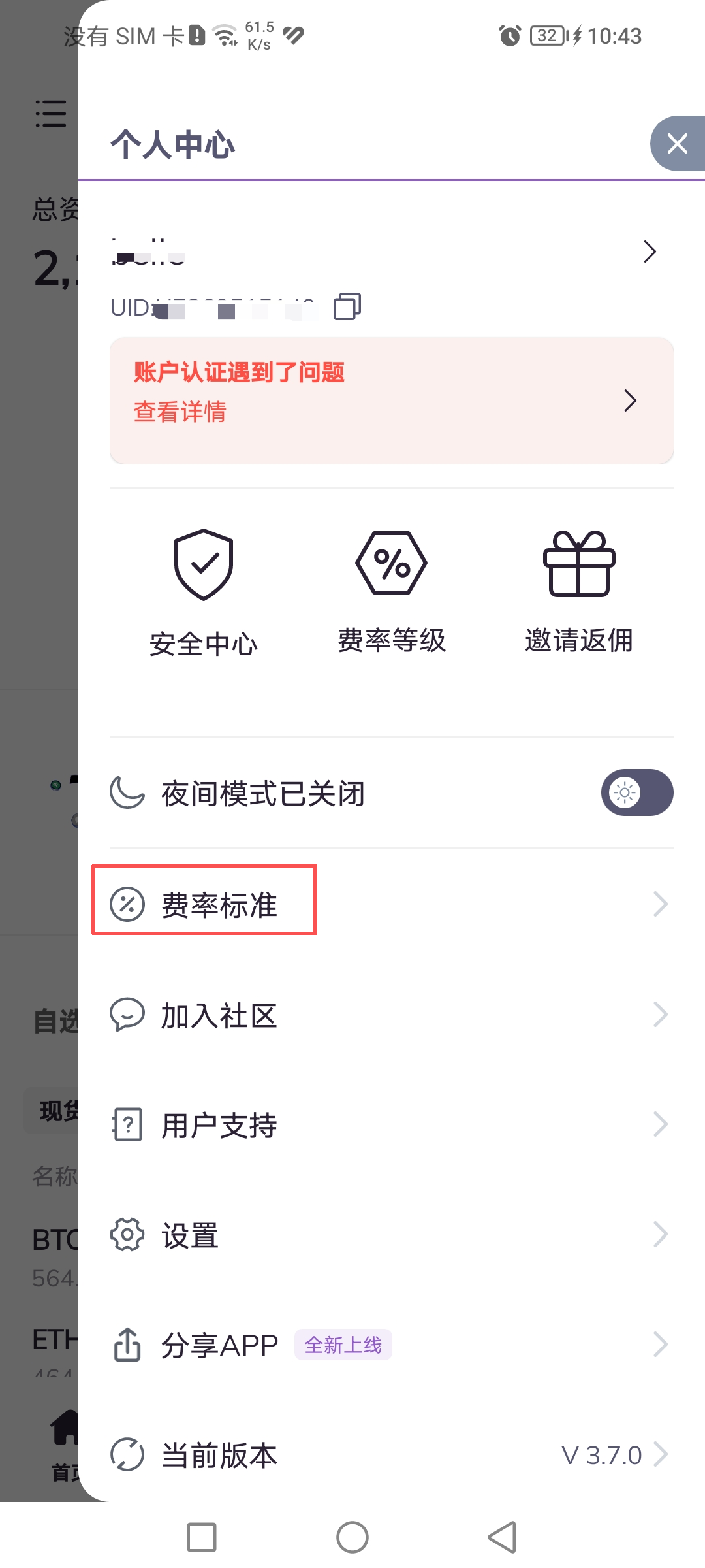 2.进入个人中心页面,点击费率标准。