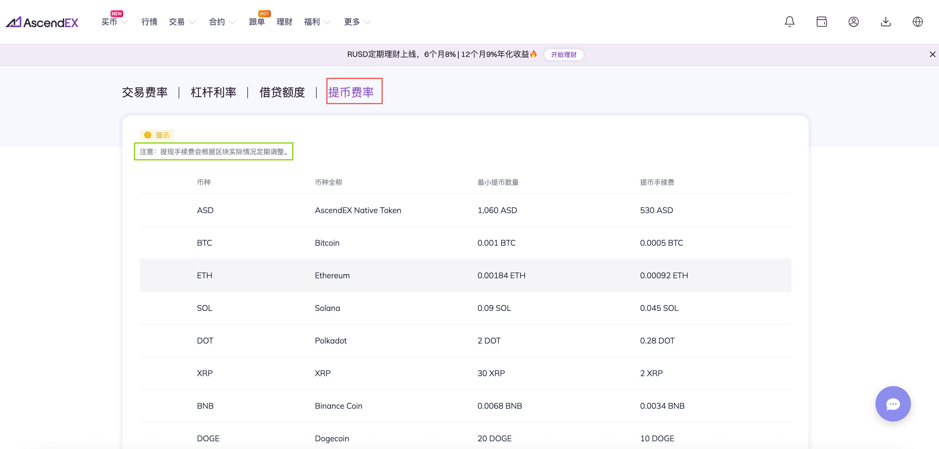 2.进入账户费率页面,点击提币费率,即可查询各币种最小提币数量和提币费用信息。
