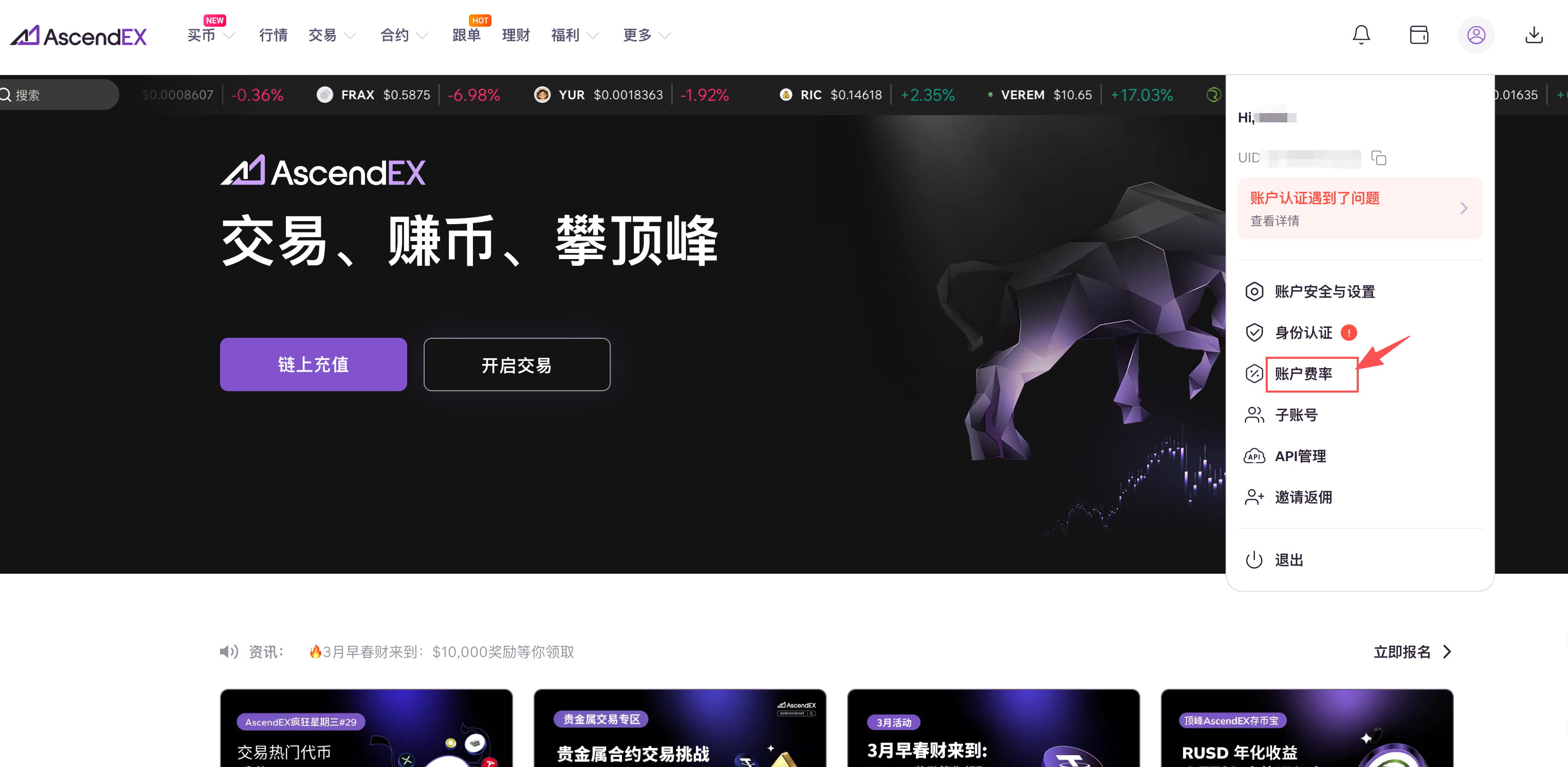 1.打开AscendEX官网,点击首页右上方个人头像,在下拉列表中选择账户费率。