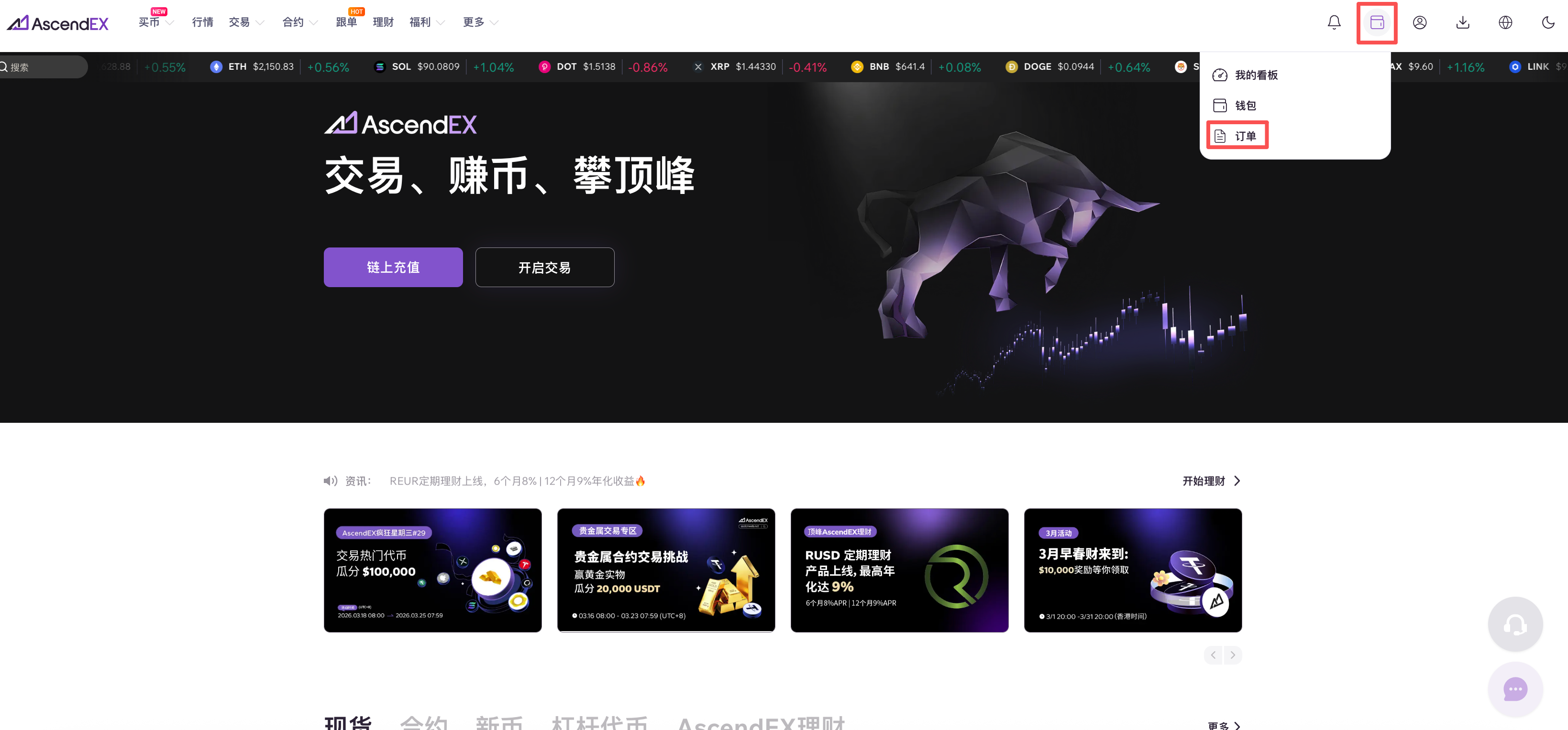 1.打开AscendEX官网,点击首页右上方订单。