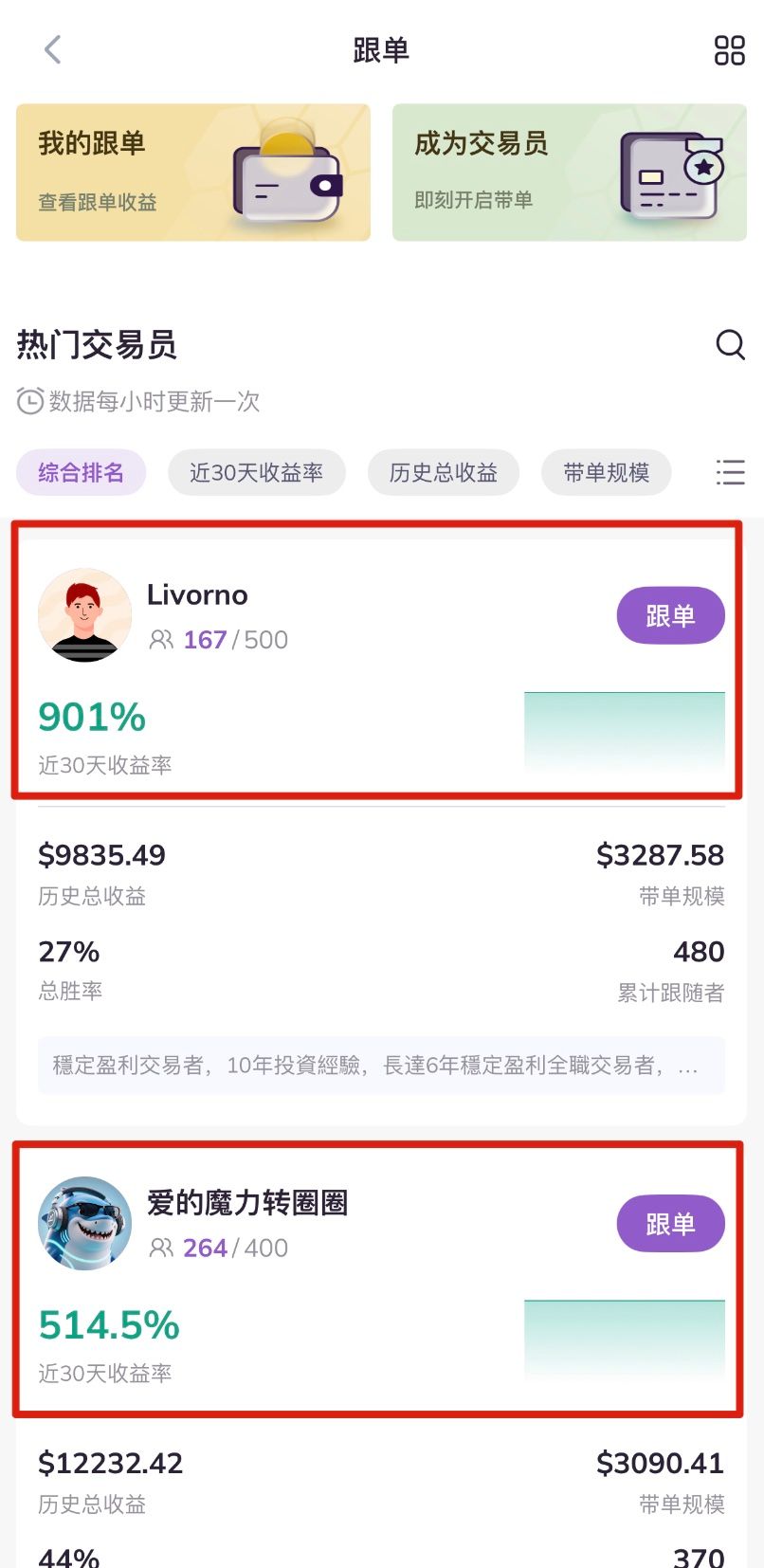 注:以上交易员交易数据每1小时更新一次,详情均可在交易员详情页面查看。