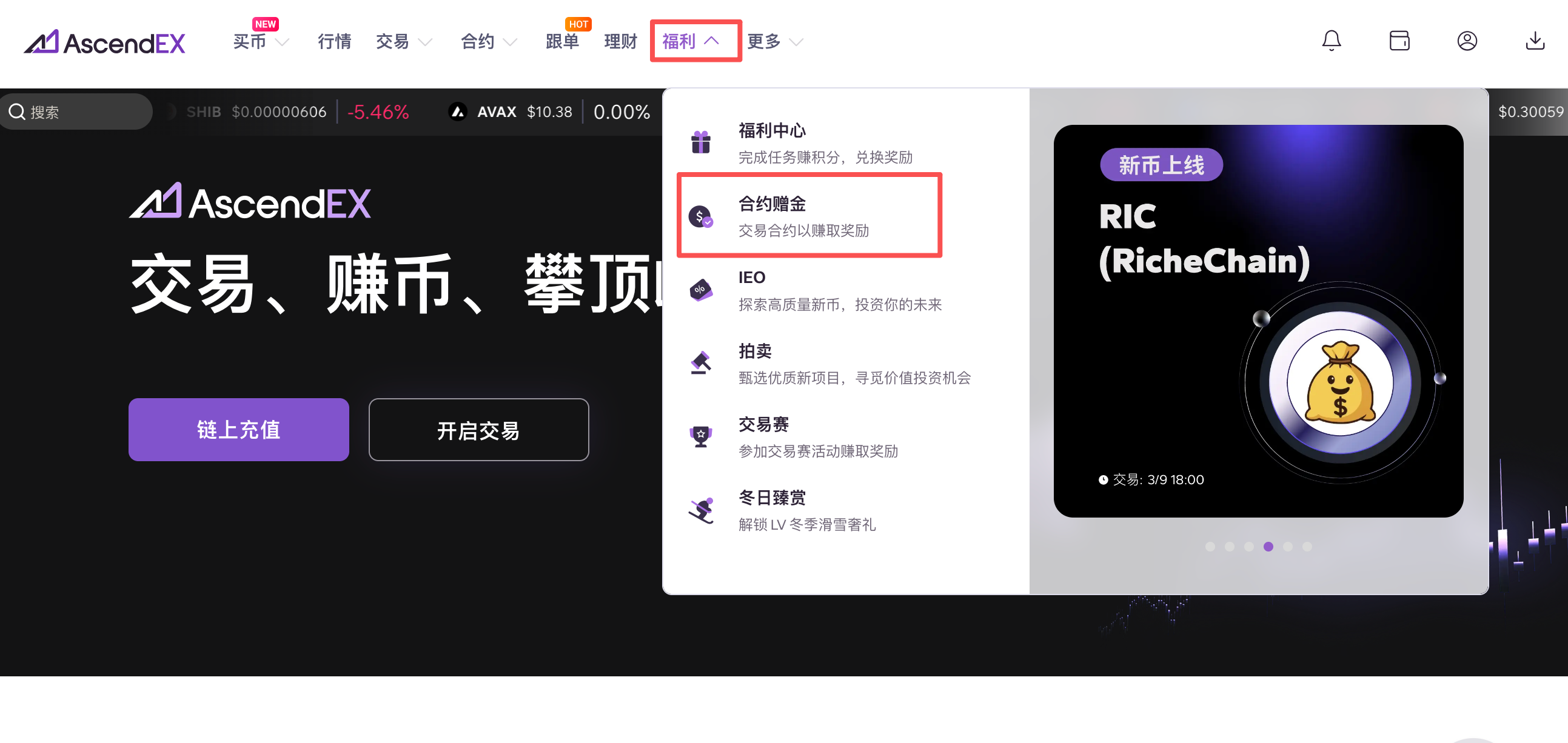 1. PC或APP端登录顶峰AscendEX账户,前往【福利】-【合约赠金】进入活动页面;