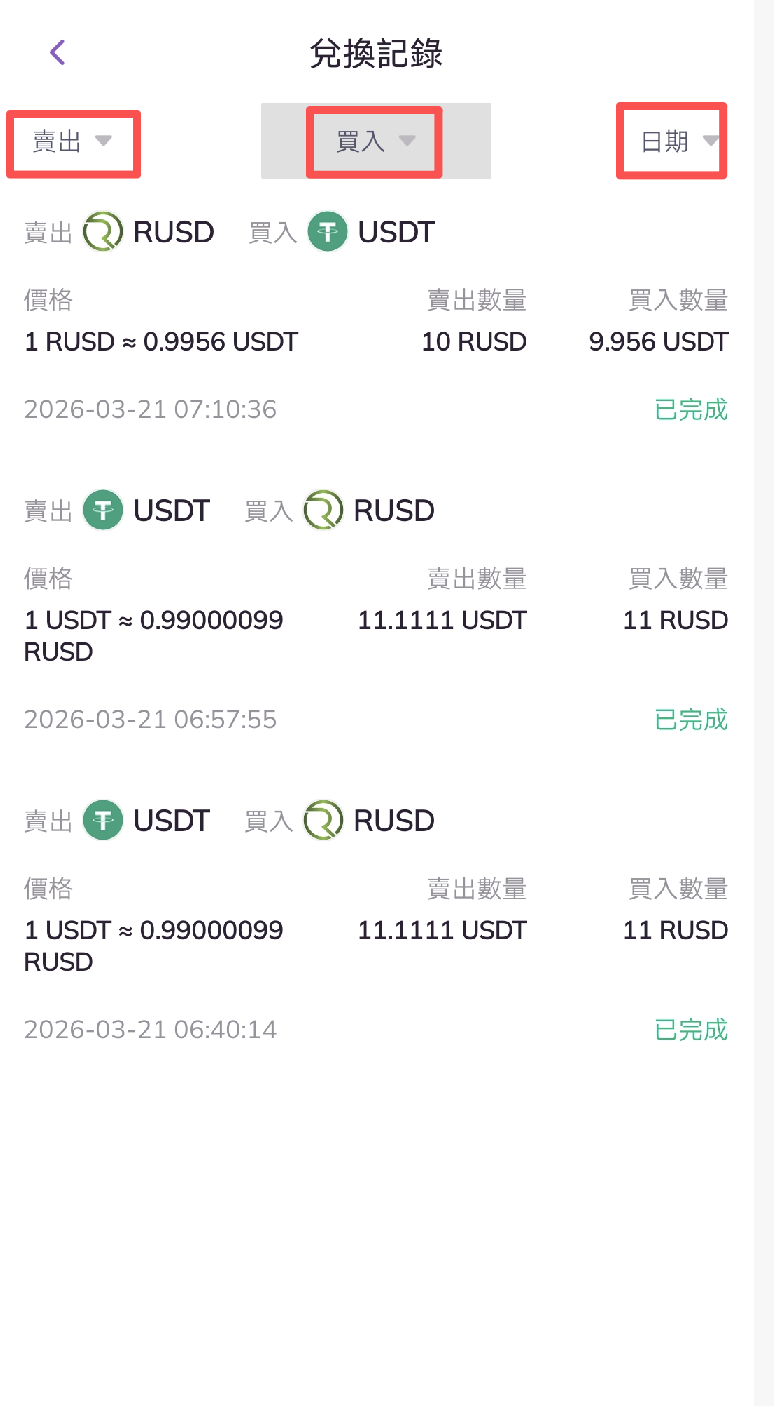 4. 進入兌換記錄頁面,即可查看您的閃兌記錄。 您還可以按照買入或賣出方向,點擊篩選查看對應幣種的閃兌記錄。